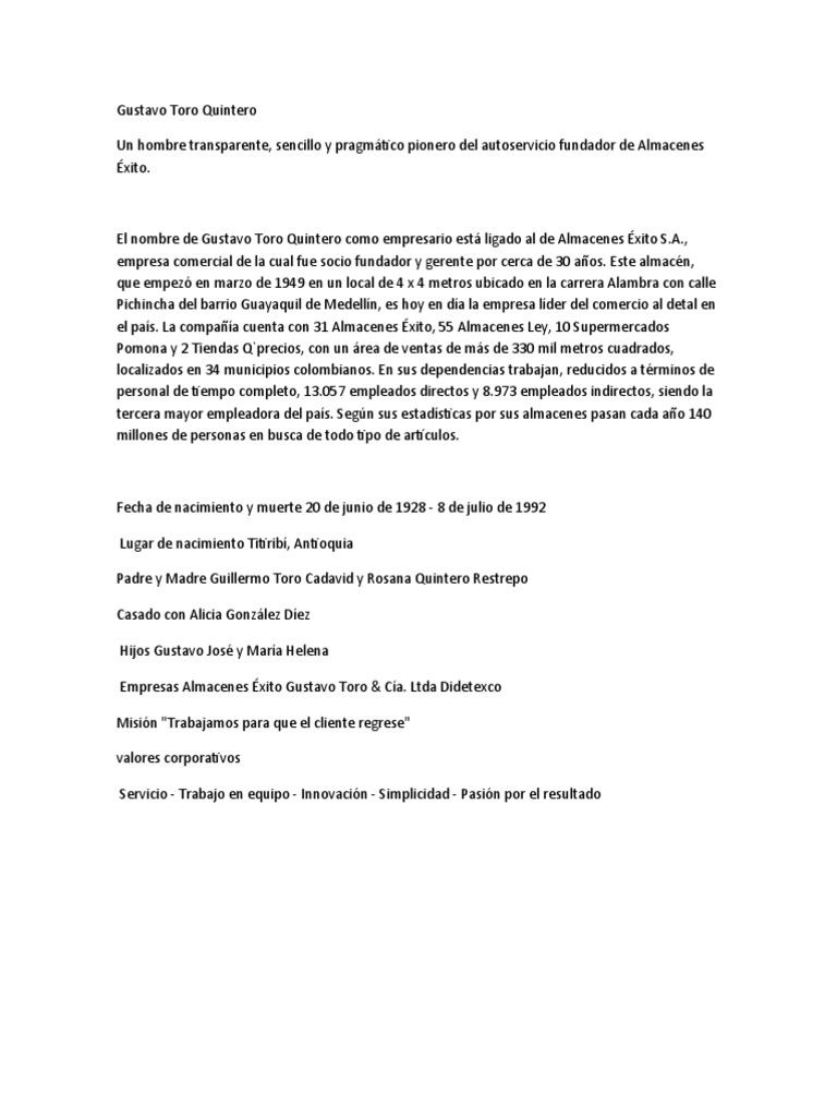 En marzo de 1949 en un local de 4 x 4 metros, ubicado en guayaquil, populoso sector de medellín, nació almacenes éxito. El servicio electoral ratificó el triunfo de gustavo toro (dc) en las repetidas elecciones municipales en la comuna de san ramón. Enviar por correo electrónico escribe un blog compartir con twitter compartir con facebook compartir en pinterest. Historia en 1949 gustavo toro quintero creo almacenes éxito s.a. Facebook gives people the power to.
